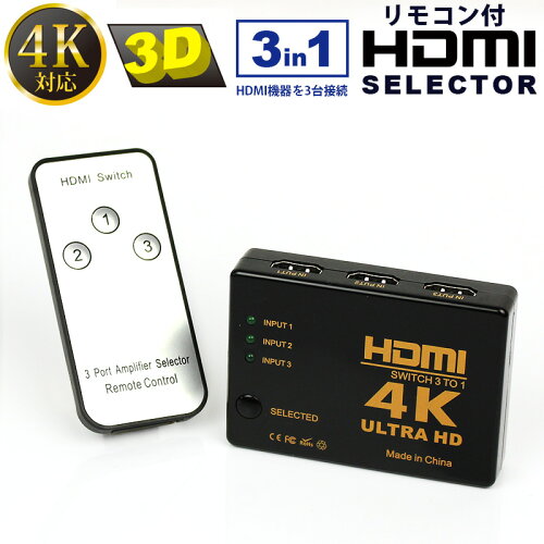 4K HDMI セレクター リモコン付き 切替器 高画質 3D対応 タイプ hdmi切り替え 3ポート 3入力1出力 3in1 リモコン付き